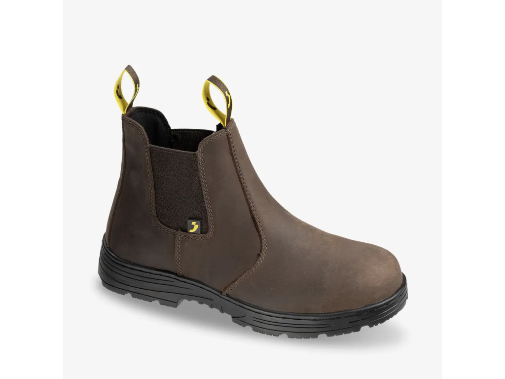 Model Jackman S3 dunkelbraun 36300 od Safety Jogger je robustná bezpečnostná členková obuv v štýle Chelsea bez šnúrok.