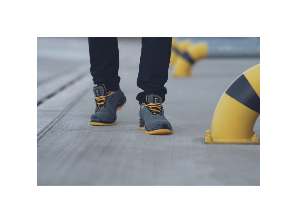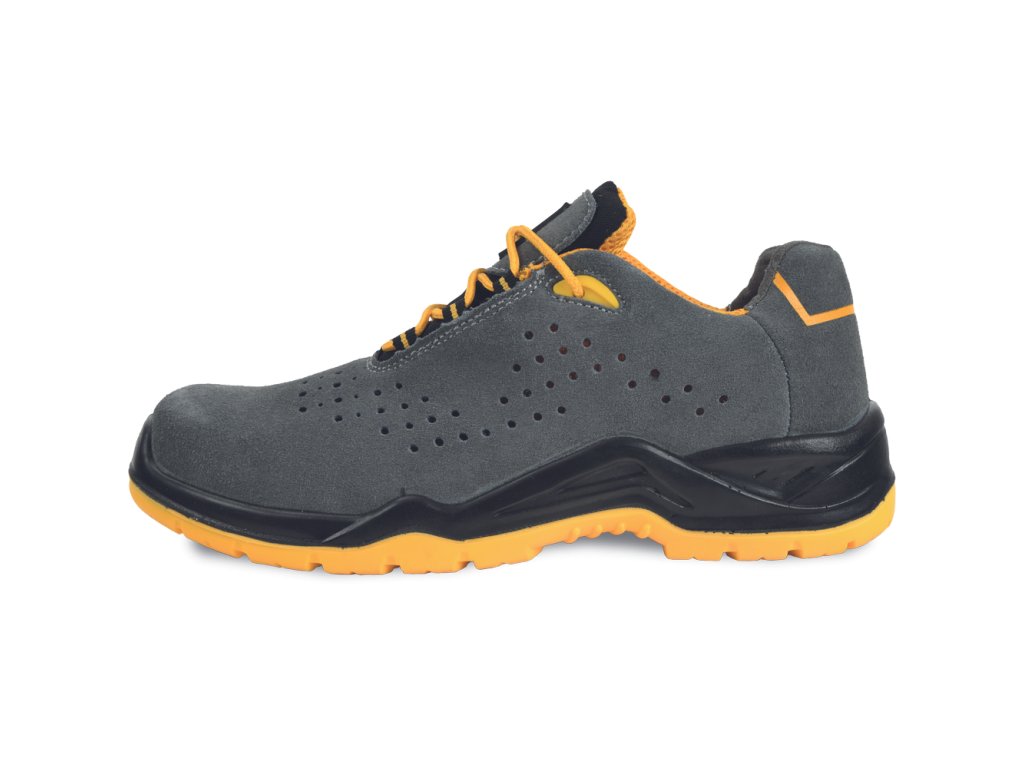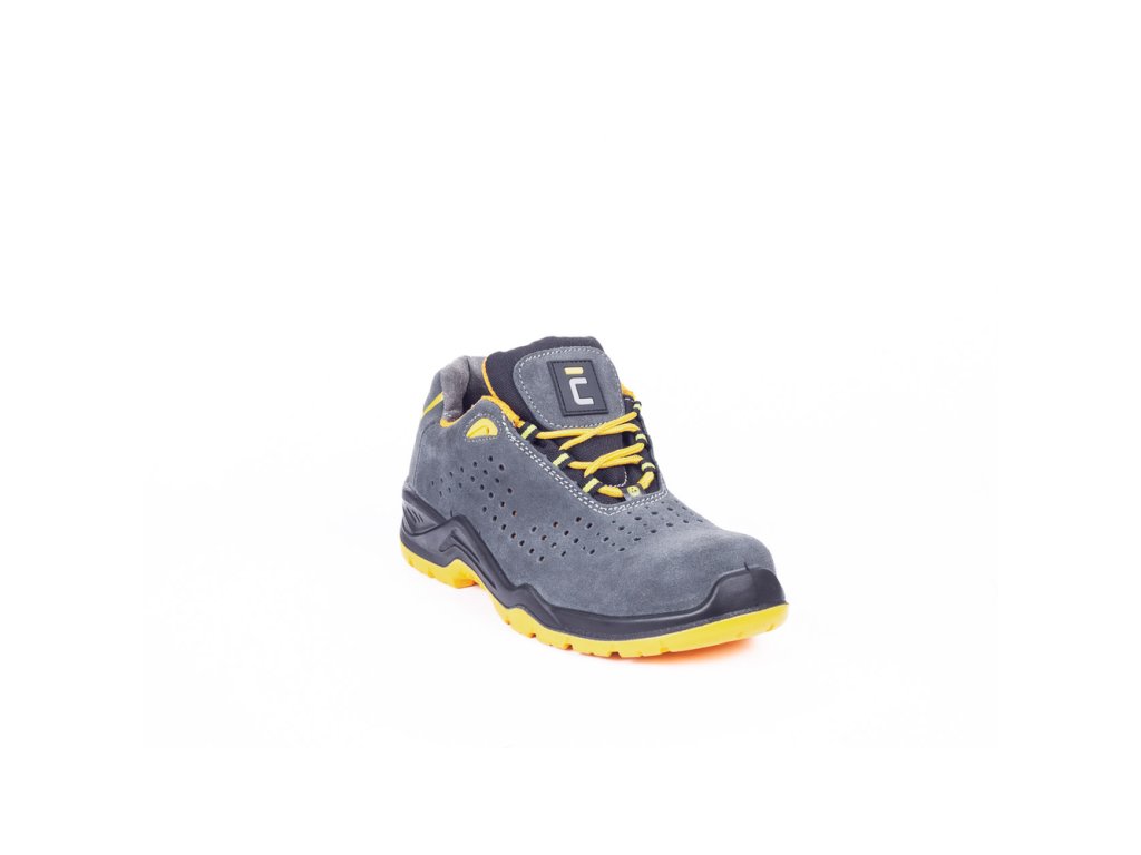 • bezpečnostná poltopánka v modernej šedo-žltej farebnej kombinácii • zvršok obuvi je vyrobený z nubuk kože a perforovaný po celej dĺžke • protišmyková podošva odolná olejom je vyrobená z dvojhustotného polyuretánu a zaisťuje maximálnu istotu pri každom kroku • obuv je vybavená komfortnou, perforovanou vnútornou stielkou, ktorá garantuje pohodlie a cirkuláciu vzduchu vo vnútri topánky • absorpcia energie v oblasti päty tlmí nárazy a obmedzuje pocit únavy nôh • vďaka bezpečnostnej kompozitnej tužinke obuv spĺňa požiadavky normy EN ISO 20345:2011 • to znamená, že chodidlá sú chránené pred stlačením silou do 15 kN alebo pádom bremena s váhou do 20kg z výšky 1m • chodidlá sú chránené aj zo spodu a to vďaka kompozitnej stielke proti prepichnutiu Obuv neobsahuje kovové súčasti a je vybavená funkciou ESD. Preto je to ideálny model pre vnútorné priestory a citlivé prostredie, kde je potrebné zabrániť vzniku iskier z elektrostatického výboja alebo pre priestory vybavené bezpečnostným rámom. Vďaka minimalistickému dizajnu sa tento model bude skvele hodiť k väčšine kolekcií pracovných odevov Cerva.