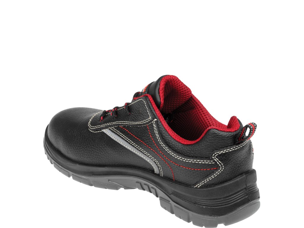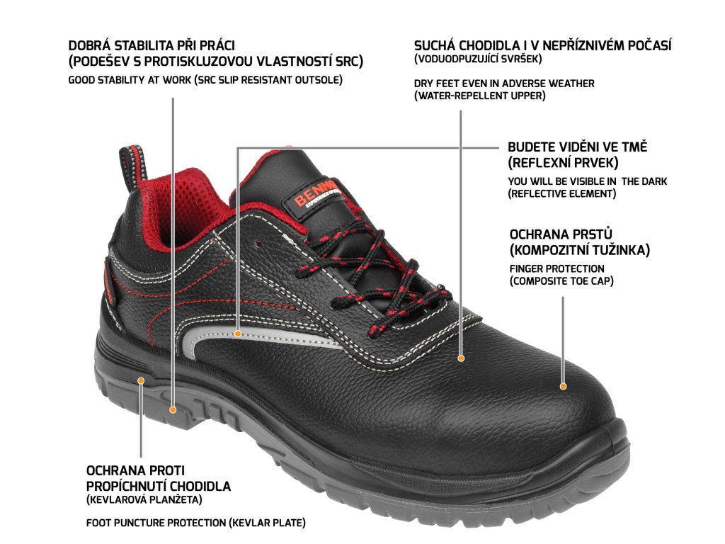 Táto pracovná obuv je vybavená odolnou kevlarovou planžetou, ktorá zabraňuje prepichnutiu chodidlá zospodu a tiež odolnú kompozitnú špičku ochraňujúcu prsty chodidla v prípade nárazu zhora.