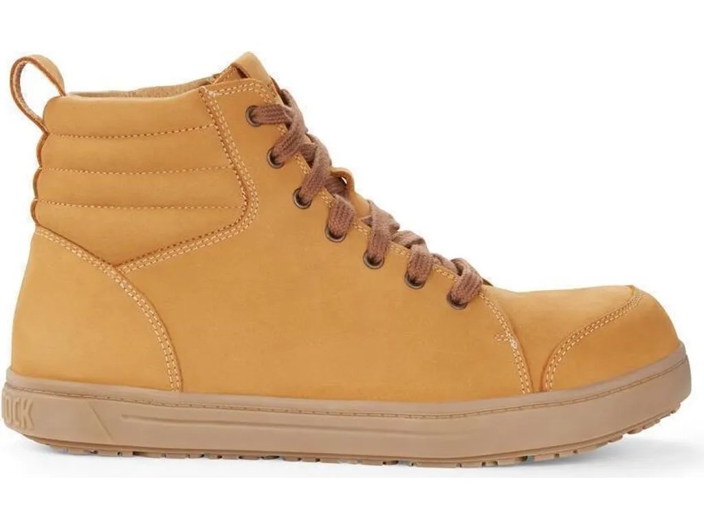 Odolný nubukový zvršok v camel farbe dodáva obuvi profesionálny a moderný vzhľad, zatiaľ čo anatomicky tvarovaná korkovo-latexová stielka Birkenstock zabezpečuje optimálnu oporu chodidla, tlmenie nárazov a pohodlie aj počas dlhých pracovných zmien.